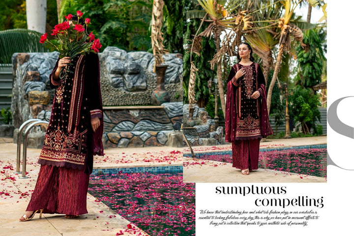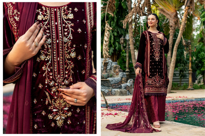 A rich scarlet-red ensemble crafted with fine golden embroidery, giving a luxurious and classy festive look. Its bold colour tone and detailed embellishment make it perfect for weddings, receptions, and evening events. This outfit delivers a graceful blend of tradition and modern elegance.
